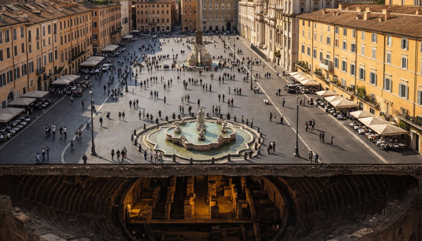 Você já sentiu que estava sendo observado pela história? Na Piazza Navona, em Roma, isso não é força de expressão. Você está, literalmente, pisando no “fantasma” de uma arena colossal.
