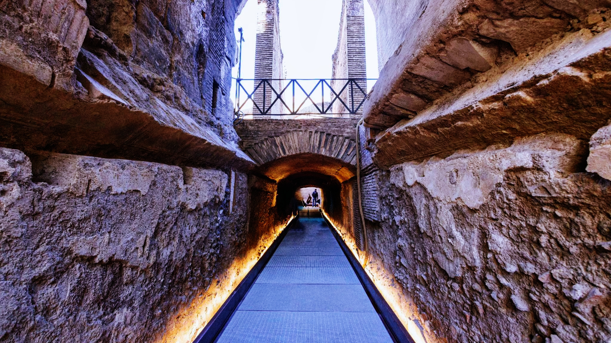 Surpreendentemente, o corredor não fazia parte do projeto original do Coliseu: foi escavado posteriormente, entre o final do século I e o início do II d.C., aproveitando os espaços das fundações e as cavidades estruturais já existentes.