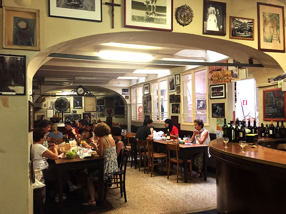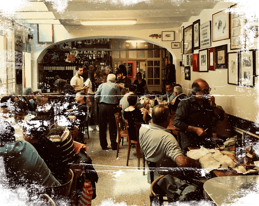 A placa é simples, quase minimalista: “Vino”. Não há cardápio de comidas, não há água, não há refrigerantes. Nada que distraia, nada que tente agradar. Ali, cada um leva o que quiser comer, como se a osteria fosse a sala de uma casa antiga onde amigos inesperados se encontram. Um pedaço de mortadela comprado na esquina, um panino improvisado, uma marmita caseira preparada com carinho antes do trabalho. Tudo cabe, tudo é bem-vindo. Eles servem somente o beber e o resto você preenche com sua história. É bonito isso, não é? Entrar num lugar onde o essencial não está no que se compra, mas no que se traz consigo.