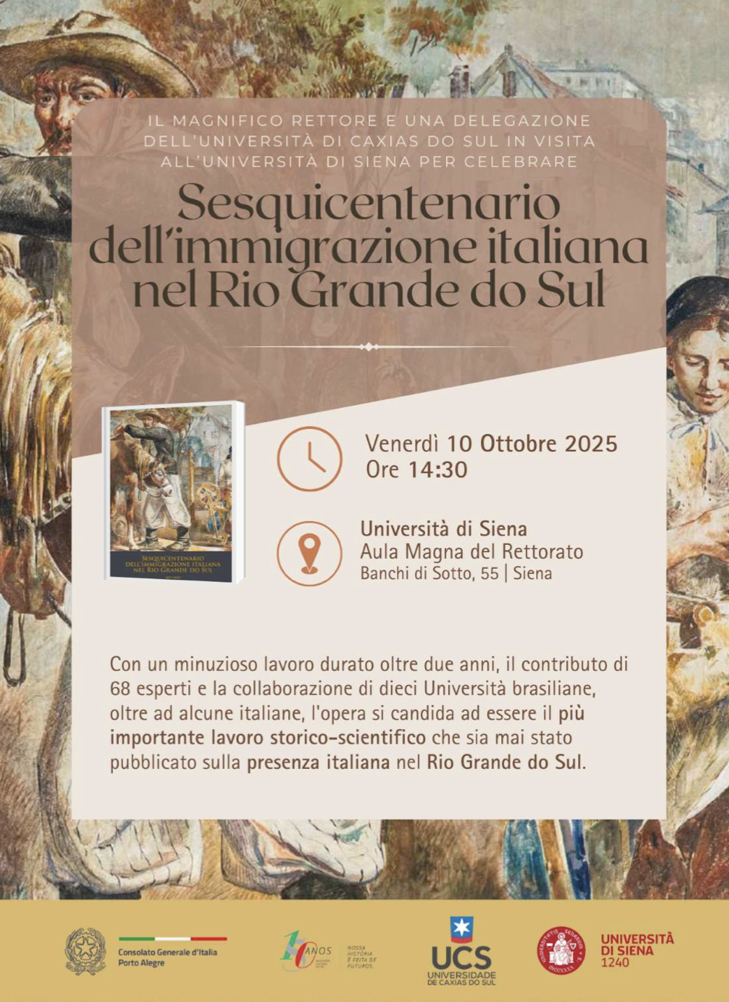 No dia 10 de outubro, às 14h30, o Auditório Principal do Reitorado da Universidade de Siena (Banchi di Sotto, 55) sediará um evento de grande valor histórico e simbólico: as comemorações pelo sesquicentenário da imigração italiana no estado brasileiro do Rio Grande do Sul, considerado por muitos estudiosos o verdadeiro berço da italianidade no Brasil.