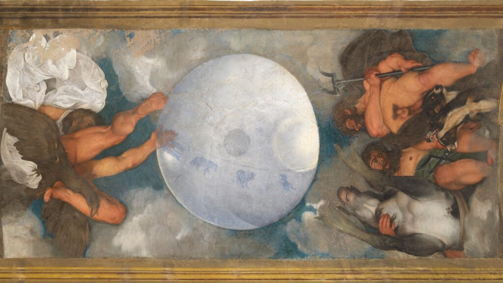 Em 1597, ele pinta sobre o reboco com tintas a óleo uma escolha irregular, quase experimental criando uma cena que é mais filosofia do que decoração: Júpiter, Netuno e Plutão giram em torno de uma esfera celeste, em uma representação que parece antecipar uma nova ideia de universo. E, de fato, por trás dessa imagem há uma mente precisa.