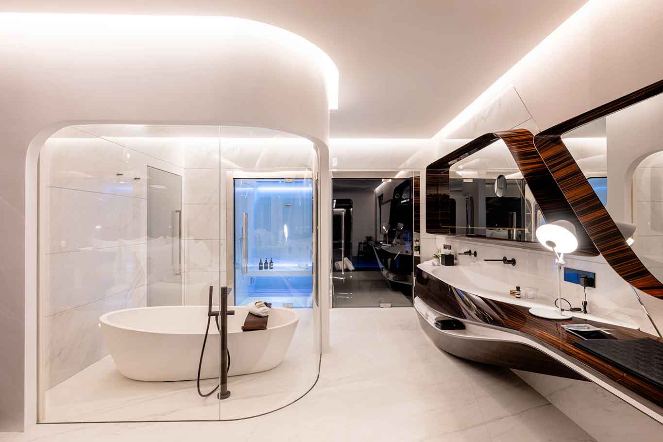 A intervenção do estúdio Zaha Hadid Architects não é decorativa, é ideológica. Linhas fluidas, curvas que lembram iates, materiais que falam a língua do luxo sem precisar ostentar: ébano Macassar, mármore Nero Marquina, mármore de Carrara.