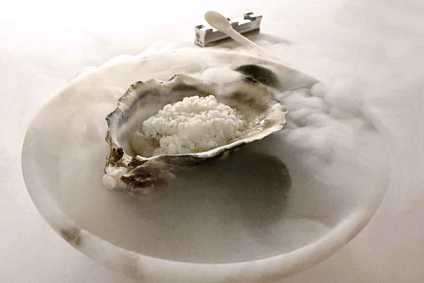 Uma ostra grelhada, acompanhada por uma granita de cítricos de Sorrento: quente e frio que se confrontam sem nunca se destruir. Uma tensão controlada.