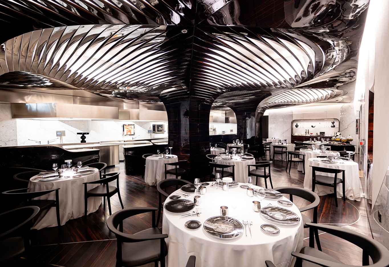 O restaurante é coerente com tudo o resto: elegante, controlado, quase teatral. A cozinha aberta separada apenas por um balcão é o verdadeiro palco. Não há bastidores. Tudo acontece diante dos olhos.