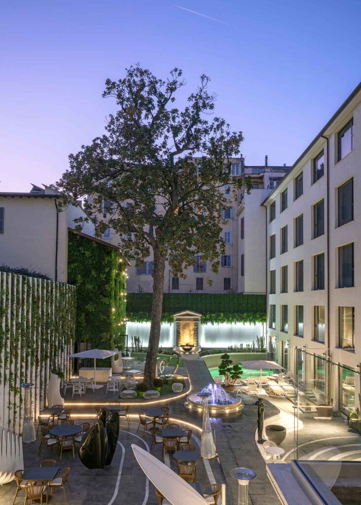 Os 74 quartos e suítes oscilam entre memória e futuro. Alguns preservam afrescos originais, outros parecem cabines de um navio que atravessa o tempo. Não é design: é narrativa espacial.