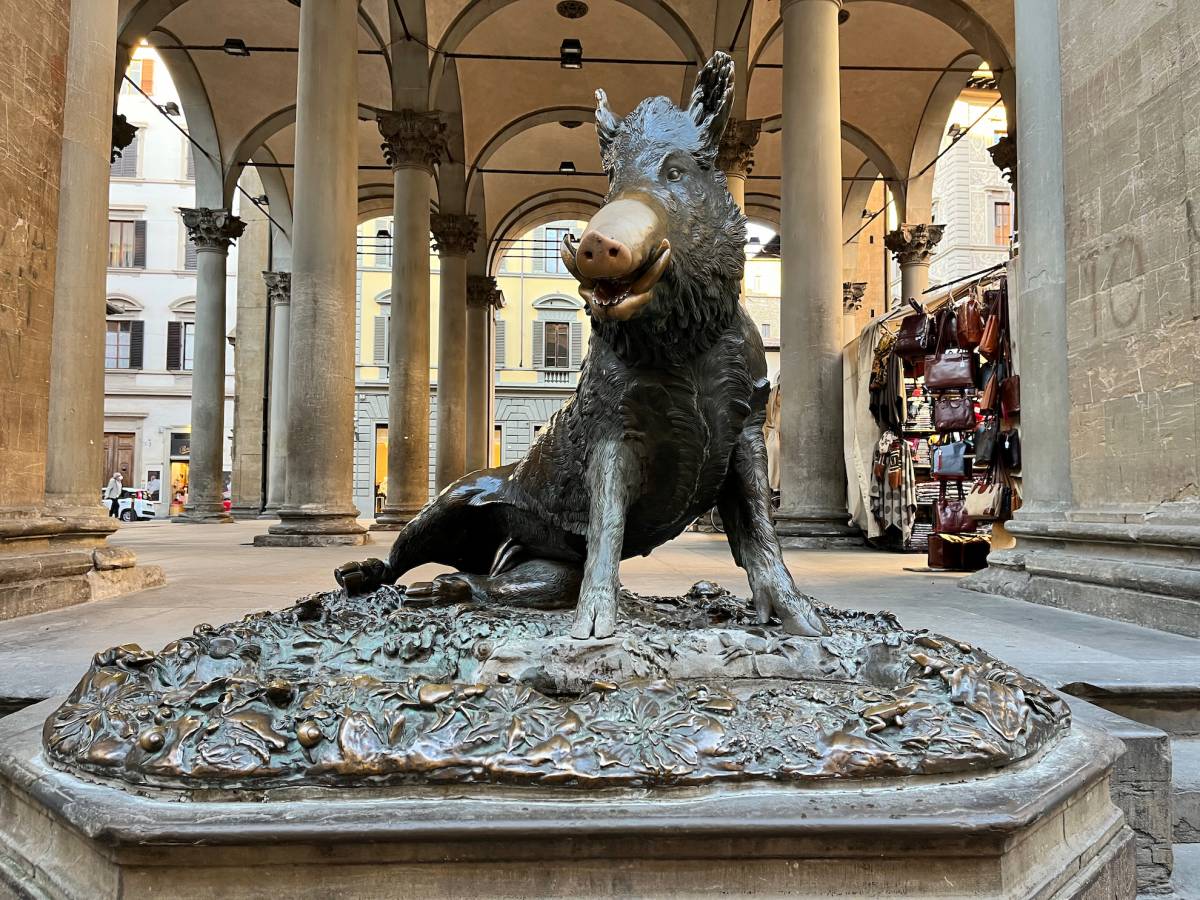 O nome engana. Aquilo que todos chamam de “Fontana del Porcellino” não representa um porco doméstico, mas um imponente javali de bronze, de corpo tenso e olhar atento. A obra que vemos hoje é uma cópia seiscentista de uma escultura helenística em mármore, chegada a Florença por vontade de Cosimo I de’ Medici, como presente de Papa Pio IV. Um objeto antigo, carregado de simbolismo, que ao longo do tempo se transformou em um dos amuletos mais famosos da Europa.