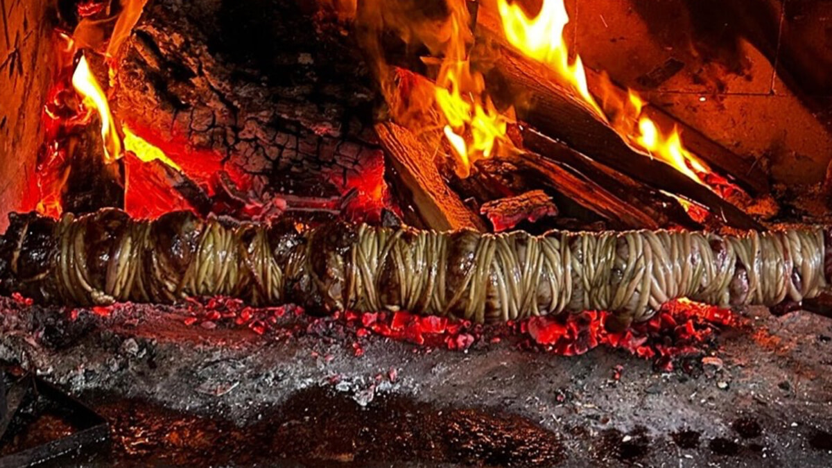 As vísceras são lavadas com rigor, cortadas com precisão quase cirúrgica, montadas no espeto segundo sequências específicas. Depois vem o gesto que distingue o prato de qualquer outra preparação: o envolvimento.