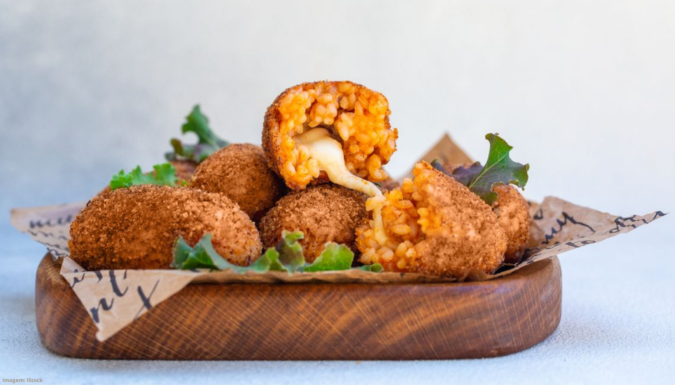 O supplì é um bolinho de arroz com crosta crocante e dourada, recheado com ragù de carne e tomate, que esconde em seu interior um coração de muçarela derretida. Esse detalhe irresistível lhe rendeu o apelido de “supplì al telefono”: ao ser aberto, o queijo forma um fio fino que lembra os antigos cabos telefônicos.