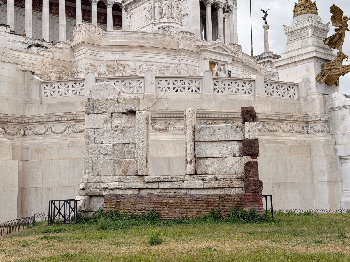 A solução foi tipicamente romana: deixá-los in situ, adaptando a cidade moderna às vestígios antigos. Assim, aqueles poucos restos permaneceram comprimidos entre novas ruas, calçadas e o monumento nacional recém-construído. Não foram valorizados como uma área arqueológica autônoma, mas tolerados como uma presença residual, quase um efeito colateral da história.